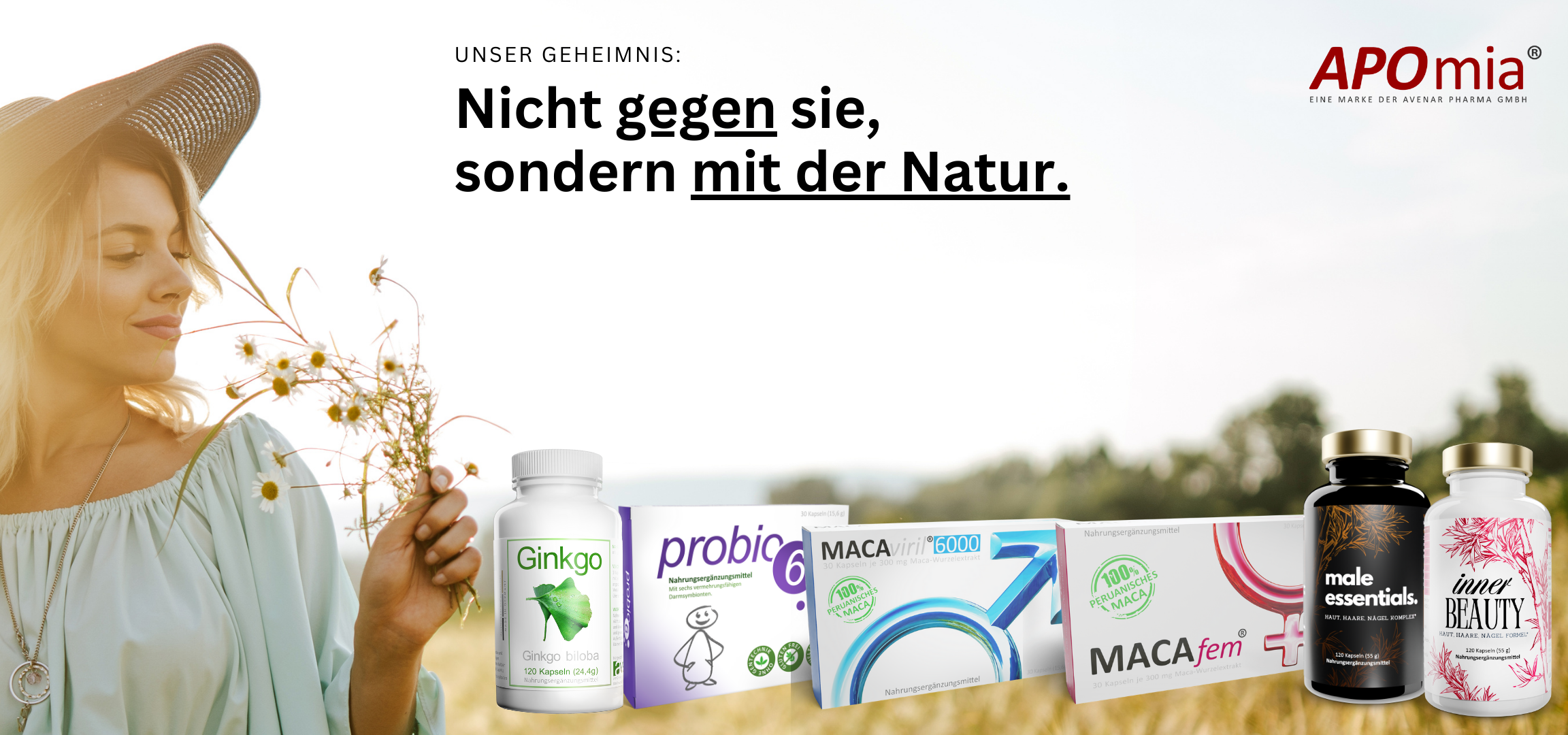 Mit APOmia® entwickelt und vertreibt avenar pharma® Premium-Nahrungsergänzungsmittel, zugeschnitten auf spezielle Anforderungen und die besonderen Bedürfnisse ihrer Kunden. Hochwertigste Rohstoffe in Apothekenqualität, Verarbeitung unter pharmazeutischen Bedingungen und der Verzicht auf alle ungewollten Zusatzstoffe und die kompromisslose Herstellung ausschließlich in Deutschland machen Nahrungsergänzungsmittel von APOmia® einzigartig.